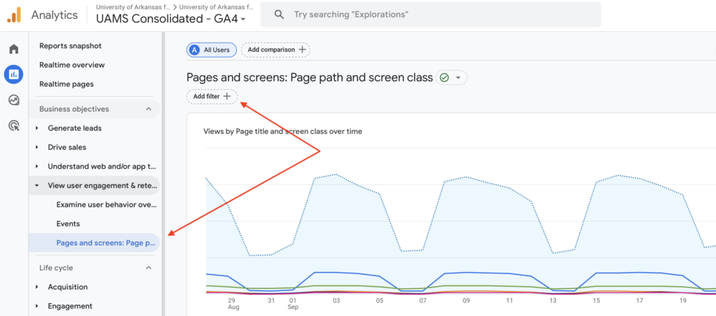 We have all UAMS sites under one Analytics Account/Property, so you will have to filter any report to only show the pages or sites you want. To do so choose, UAMS Consolidated – GA4 > User engagement & retention > Pages and screens.